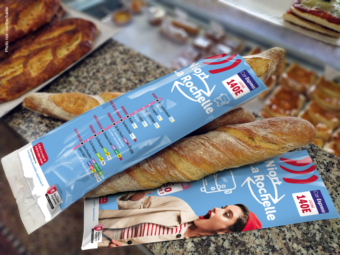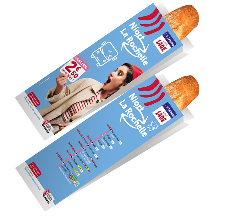 Création d’un visuel attractif pour Keolis Littoral afin de promouvoir une ligne de bus auprès du grand public, décliné en support print et diffusé sur sac à pain pour une communication locale originale et impactante.